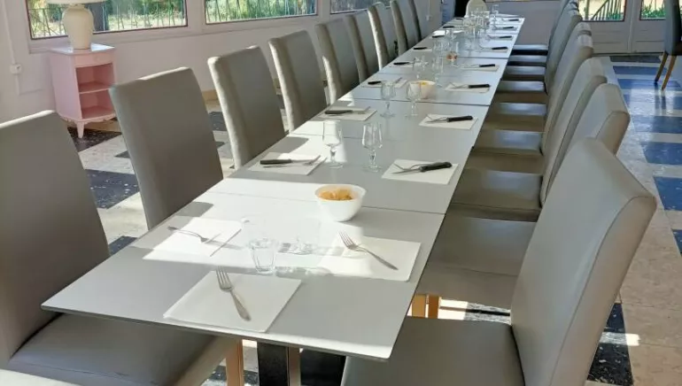 Salle de restaurant climatisée, très lumineuse aux larges baies vitrées, terrasse au bord de la piscine, sont à votre disposition pour vos petits déjeuners et dîners. Le chef vous propose une cuisine traditionnelle avec des produits locaux du Languedoc Roussillon.