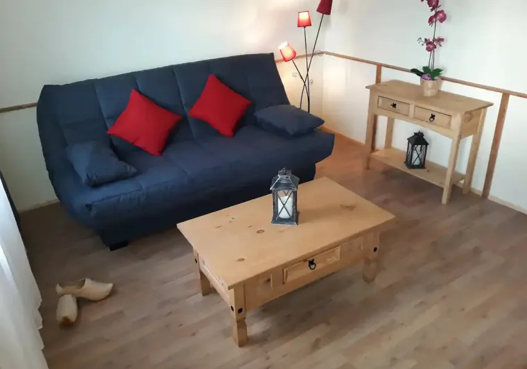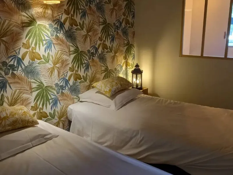 Chambre avec 2 lits.Un séjour cuisine équipé lumineux.